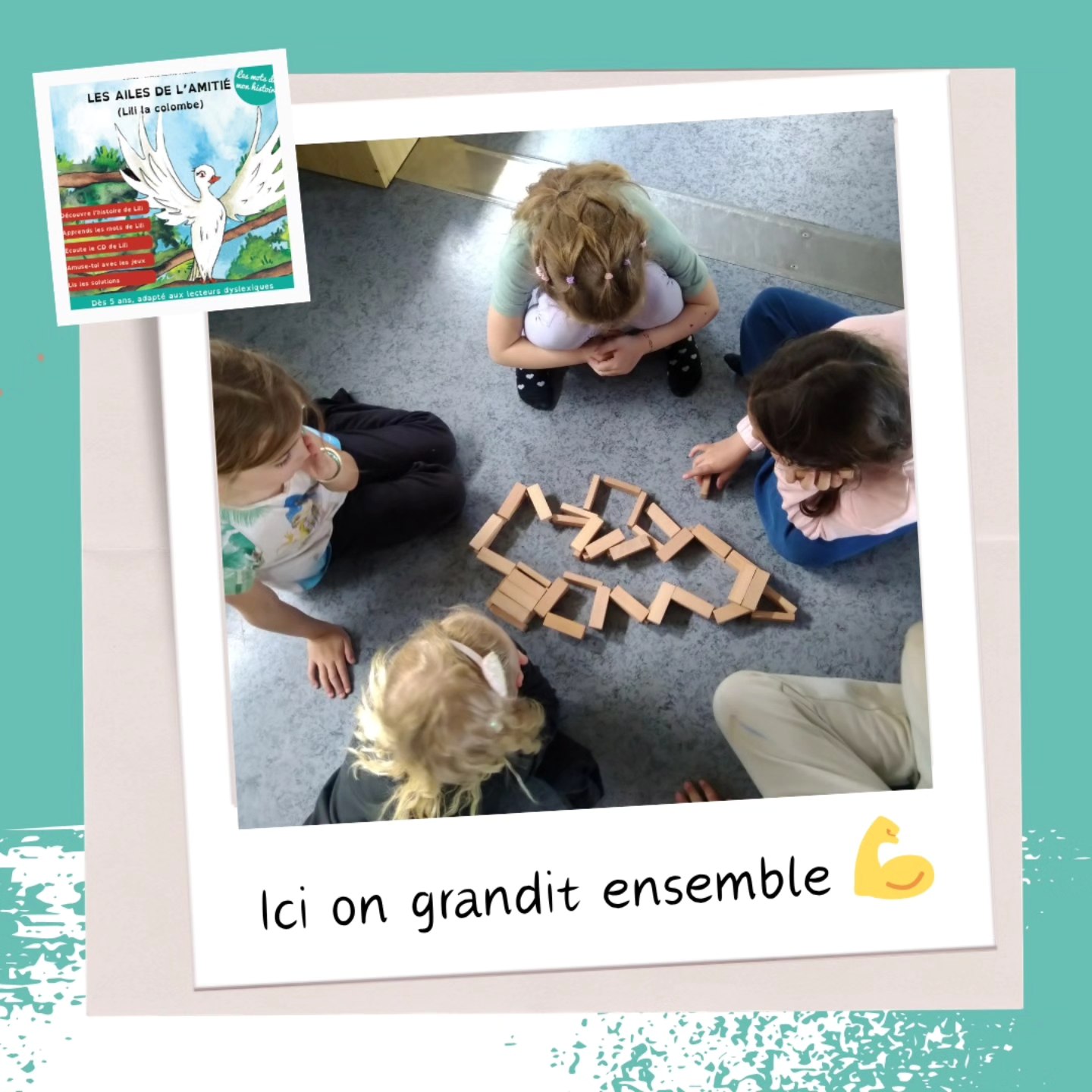 Dernièrement, j’ai animé cet « atelier pour bien grandir » (5-9 ans) sur le thème en l’amitié et de la collaboration avec l’histoire de Lili et Lip, « Les ailes de l’amitié ». Après la lecture de l’ouvrage, on a vu que lorsqu’on a des qualités et des forces différentes, on arrive à faire des choses qu’il n’est pas possible de faire seul.
